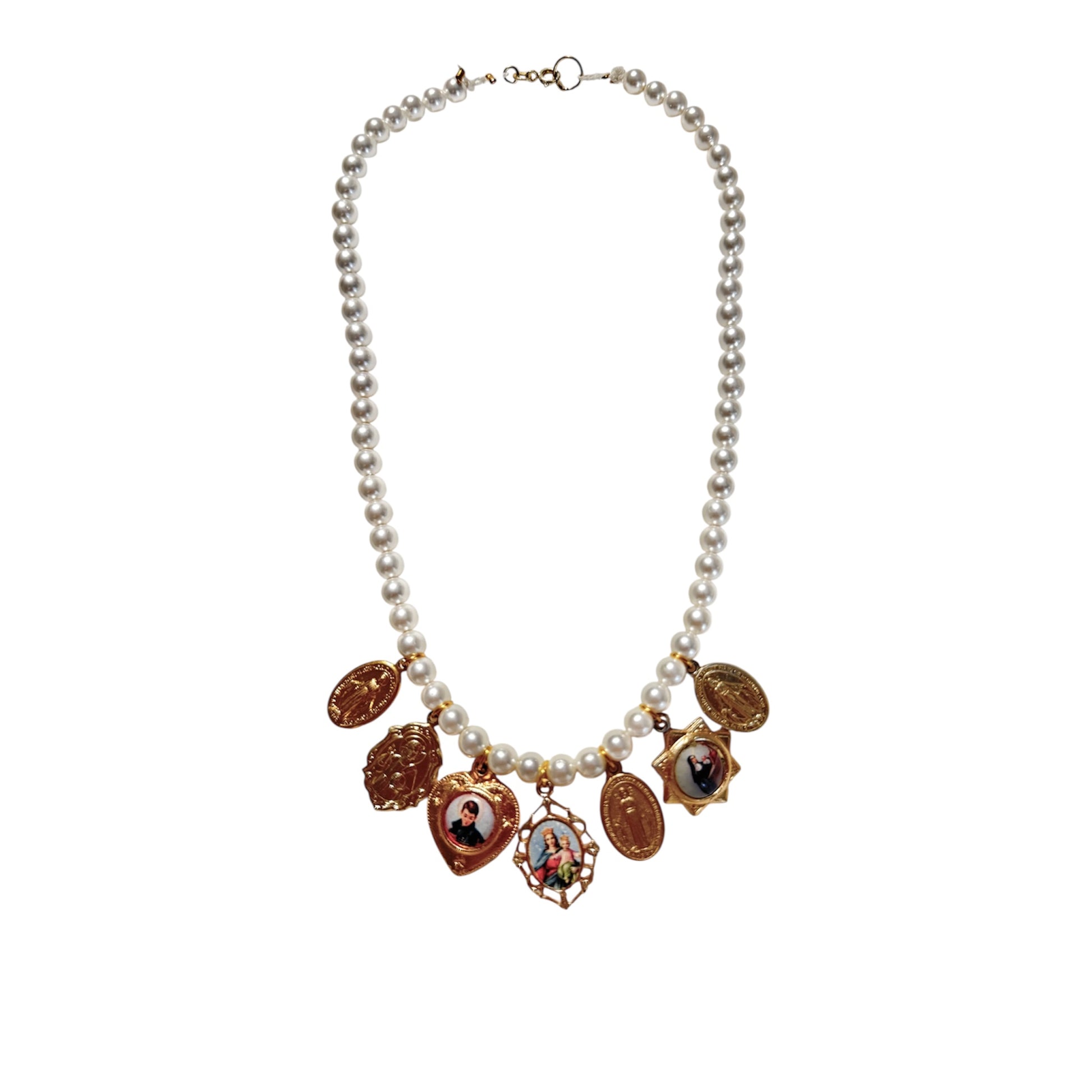Girocollo in Perle di Maiorca molto luminose da 0,5 cm con ciondoli unici realizzati con medagliette sacre vintage.