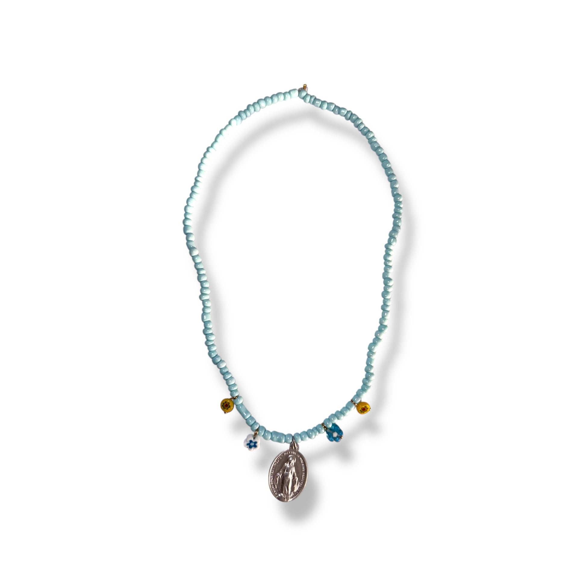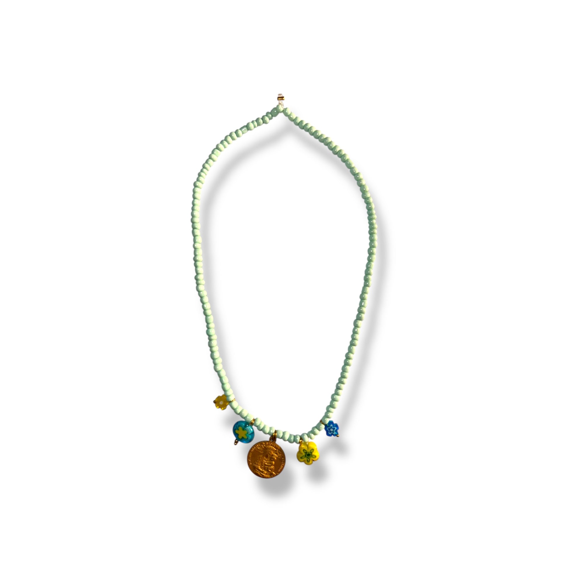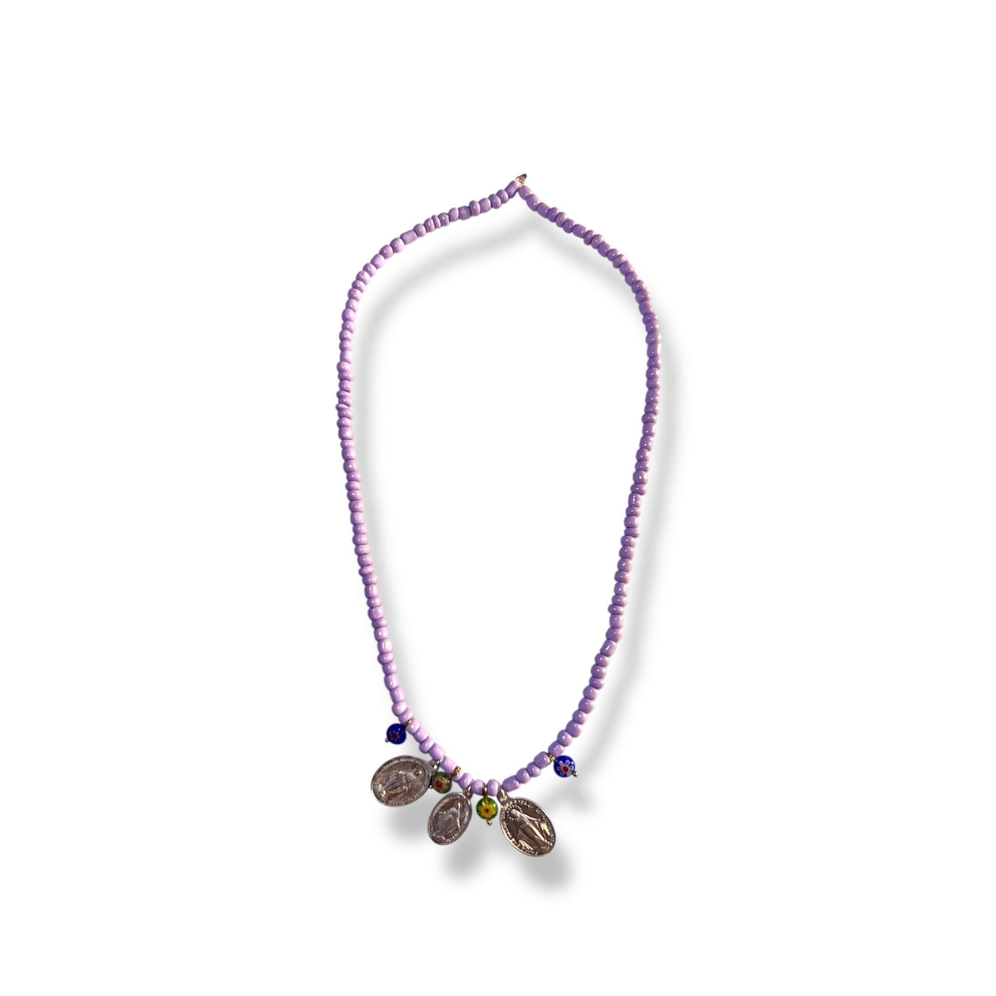 Collana artigianale in stile boho, realizzata con murrine in vetro colorato e medaglietta vintage.